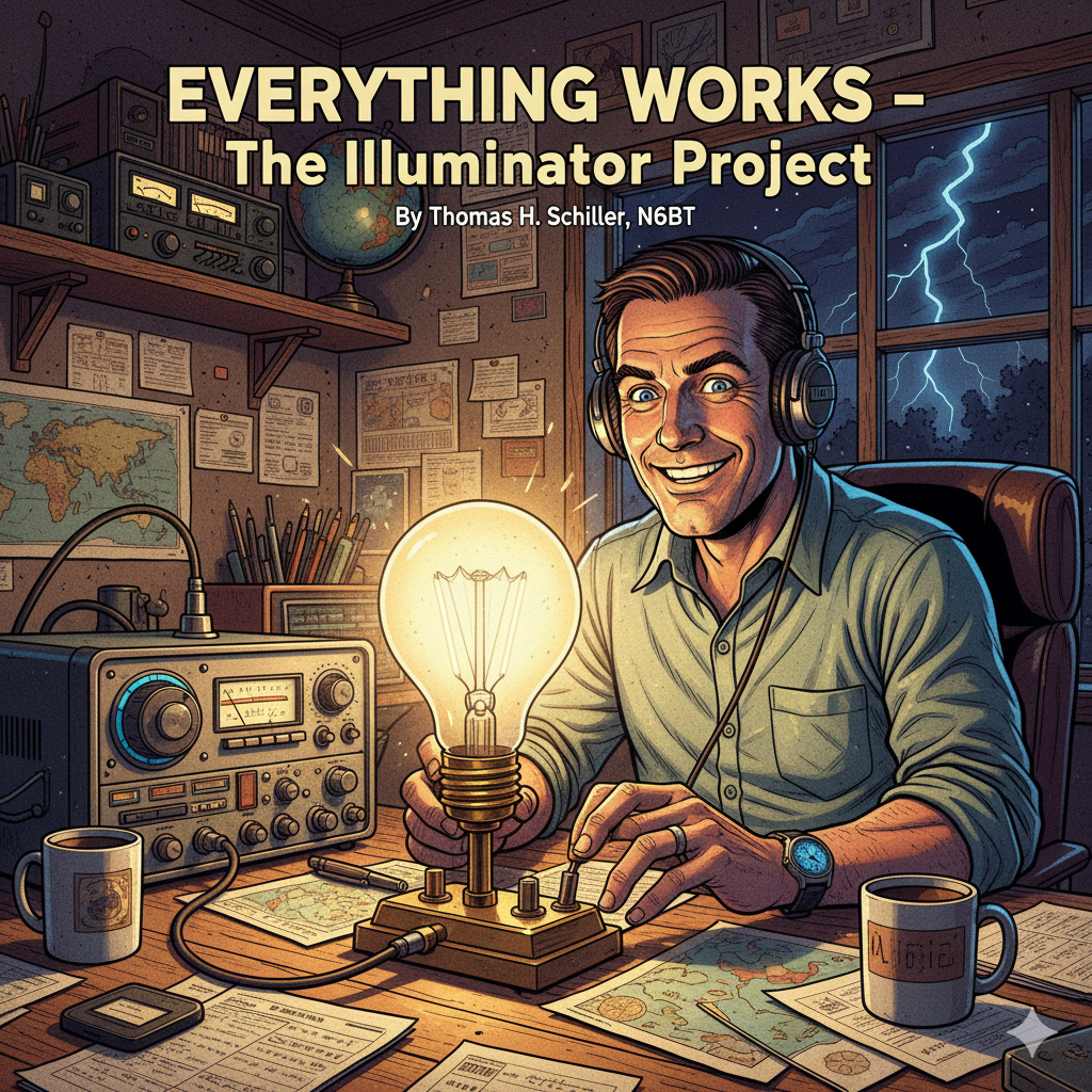 Zbliżały się zawody ARRL DX CW. Operuję w zawodach od ponad 35 lat, ale nigdy nie czułem się tak źle wyposażony do wołania kogoś. Było przedpołudnie w sobotę, a wiatr i deszcz uniemożliwiały pracę na zewnątrz. Wiedziałem, że czas wejść na pasmo. Słyszałem kilka stacji DX obsługujących pile-upy. Pierwszą stacją, którą postanowiłem spróbować, był V47KP. Nadaję mój znak z prędkością 36 WPM — odpowiada natychmiast. Jedno zawołanie. Idealnie. To było tak, jak używanie „prawdziwej anteny”. Hej, to nie był tylko mój pierwszy DX na żarówce, ale nowy rekord odległości. Moje sporadyczne operowanie przy użyciu anteny The Illuminator przyniosło 14 krajów na 10 metrach pierwszego dnia. Przyniosłem log na kolację składkową Klubu Krótkofalowców z Paso Robles tego wieczoru i Larry, W7CB, zauważył, że brakuje mi Afryki do dyplomu Worked All Continents (WAC – Wszystkie Kontynenty). Aha — kolejne wyzwanie!