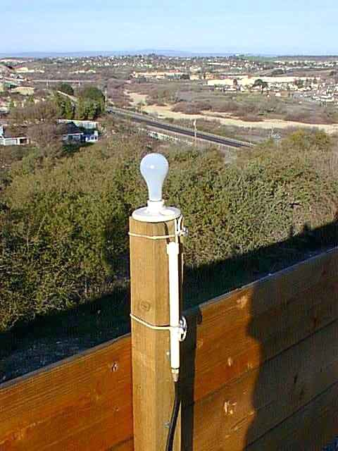 Do roli anteny wybrano żarówkę 150 W, a użyto transceivera TS-850S. Iluminator, ach, antena, hmm, sztuczne obciążenie zostało zamontowane na porcelanowej podstawie na szczycie drewnianego słupka ogrodzeniowego na wysokości około 4 stóp. Żarówka jest zasilana przez balun prądowy Force 12 B-1 z 3-calowymi wyprowadzeniami, a linią zasilającą był kabel 9913 Flex, aby zminimalizować straty. Balun został użyty, aby zapewnić, że linia zasilająca nie będzie promieniować. VSWR 150-watowej żarówki wynosił około 4:1 i wbudowany tuner dopasował go z łatwością. Później wykorzystałem zewnętrzny tuner do wprowadzania małych zmian, gdy żarnik się nagrzewał i zmieniał impedancję.