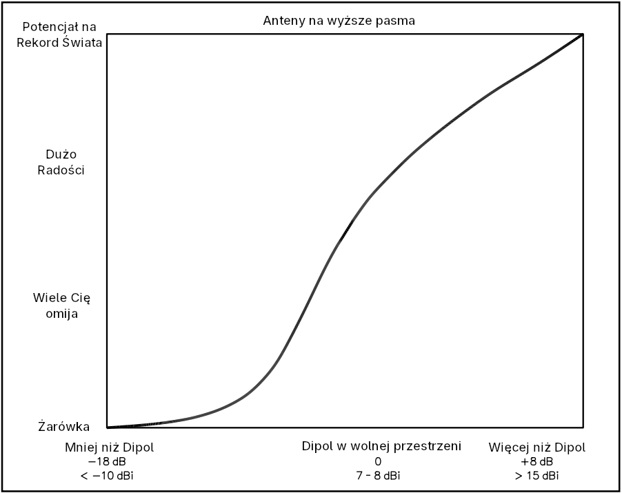 Wykresy nie mają na celu sugerowania, że niemożliwe jest cieszenie się radiem z czymś gorszym niż dipol w wolnej przestrzeni. Możliwość usłyszenia czegokolwiek i zrobienia QSO może być przyjemna, ale niekoniecznie przesunie nas dalej, by dzielić więcej radości z radia. Powinniśmy rozpoznać możliwości, zakres możliwości naszego obecnego systemu antenowego i zastanowić się, czy jest kolejny krok, który możemy podjąć — tak jak w mojej historii, przechodząc z jednej anteny na drugą i dokonując odkryć.