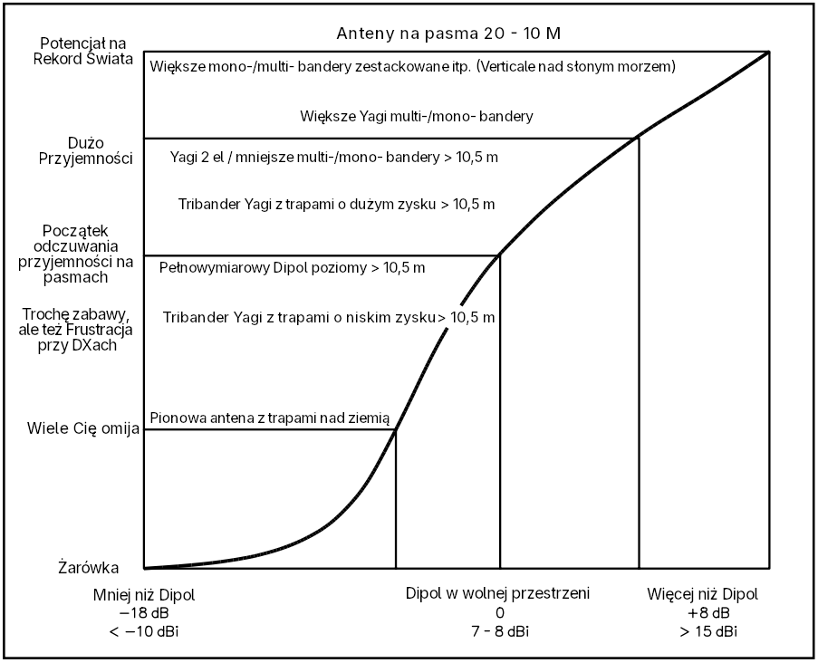Gdy jesteśmy na poziomie wydajności poziomego dipola (w wolnej przestrzeni), radzimy sobie bardzo dobrze i doświadczymy dużo zabawy i radości z Krótkofalarstwa. Poniżej tego zakresu możliwości będziemy w stanie zrobić QSO, ale nasze rozumienie aktywności na pasmach będzie ograniczone. Jeśli myślisz, że jesteś w tym punkcie, spróbuj czegoś skuteczniejszego! Spróbuj czegoś, co “działa lepiej”.